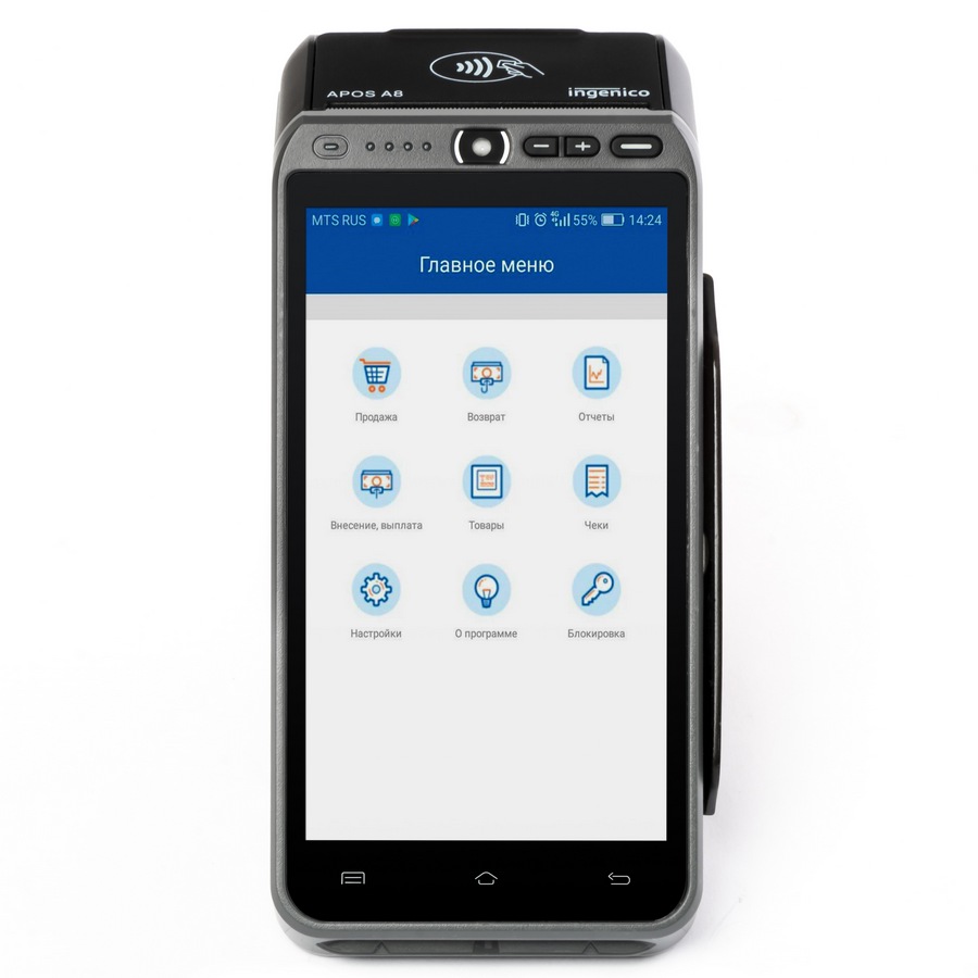 ШТРИХ-КАРТ-Ф - мобильная онлайн-касса на базе Android, с сенсорным экраном 5,5 дюймов, в возможности которой входят: